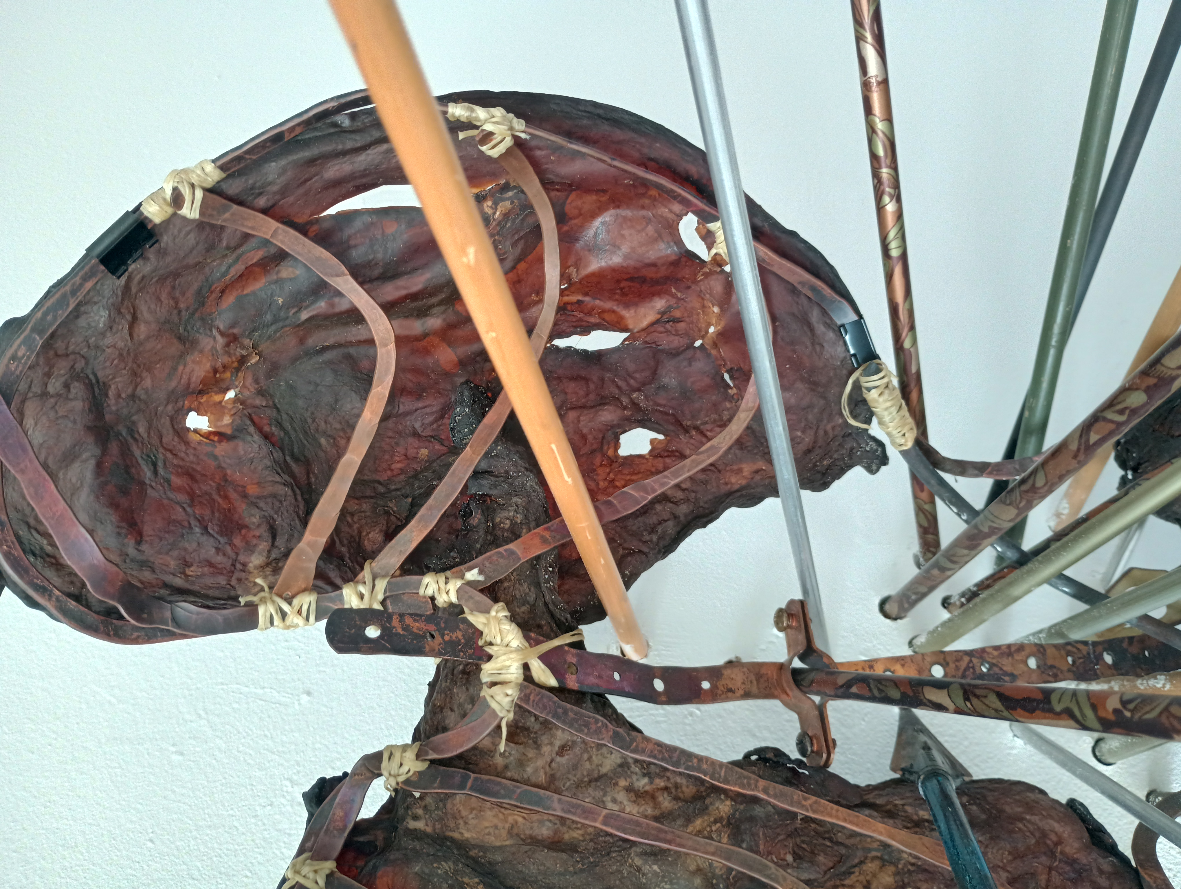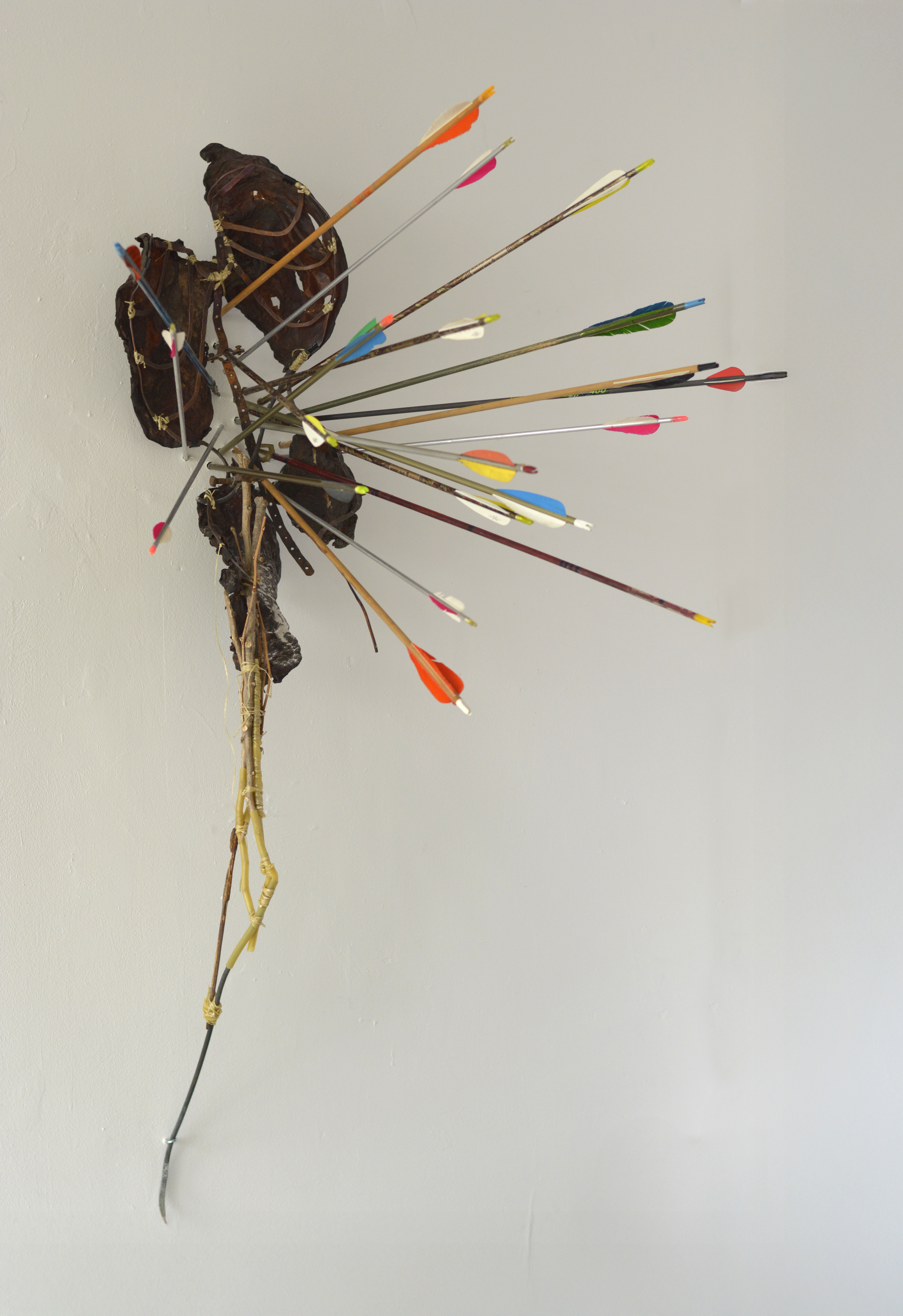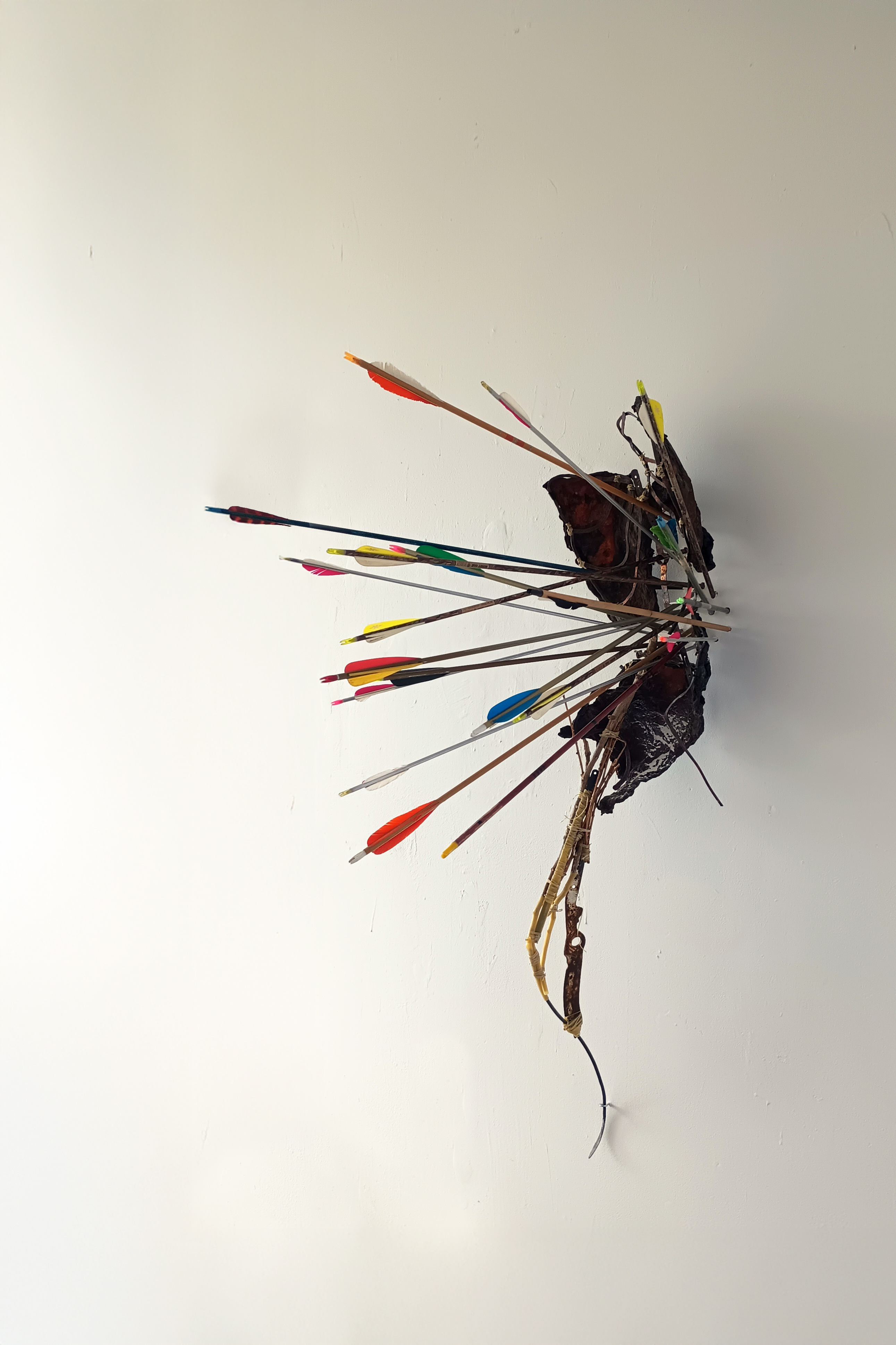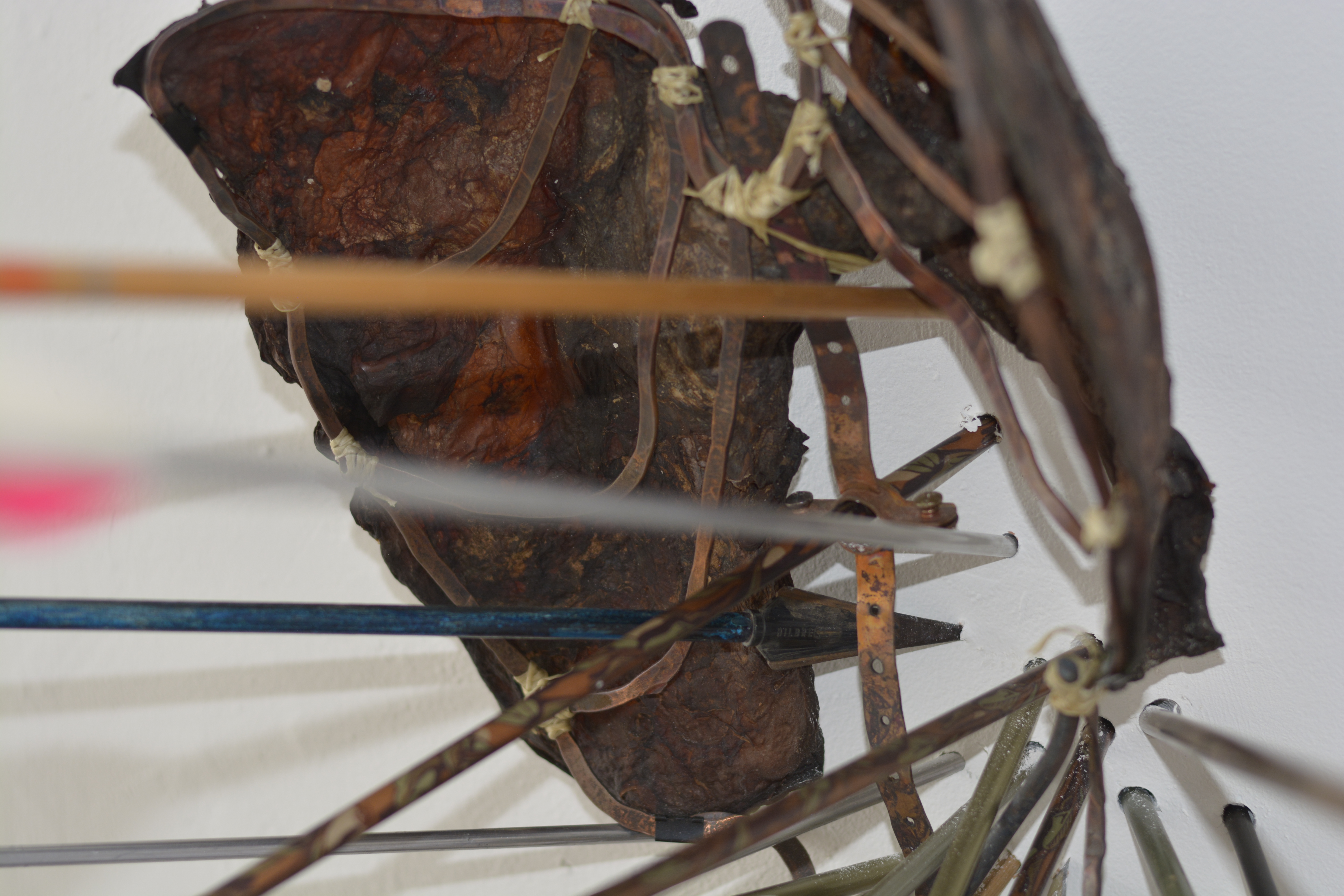 Bacterial cellulose, hammered copper, artificial sinew, rubber, assorted vintage arrows, drywall, found metal and wood. One of the Saint Sebastian series of works. 2025.