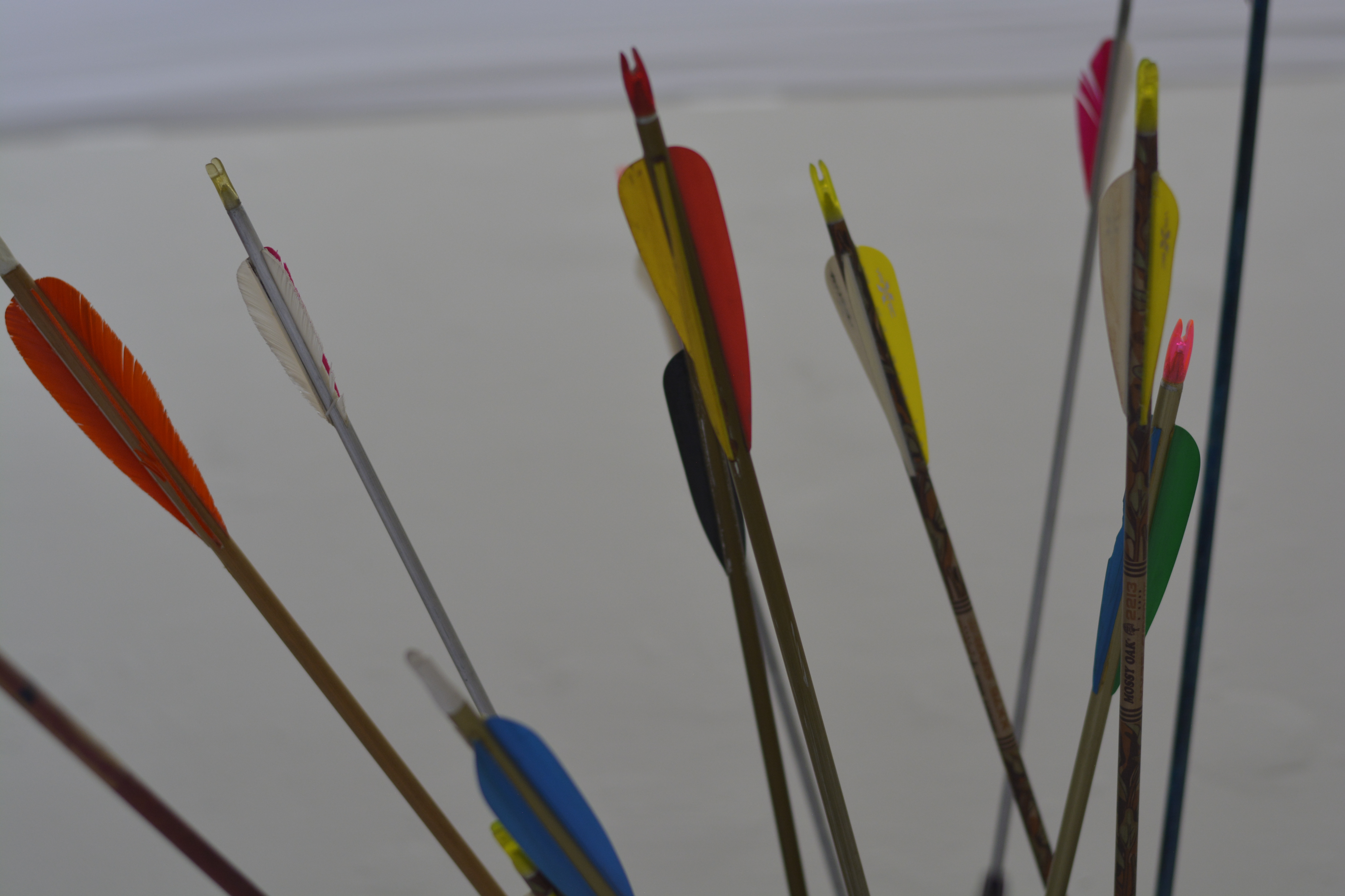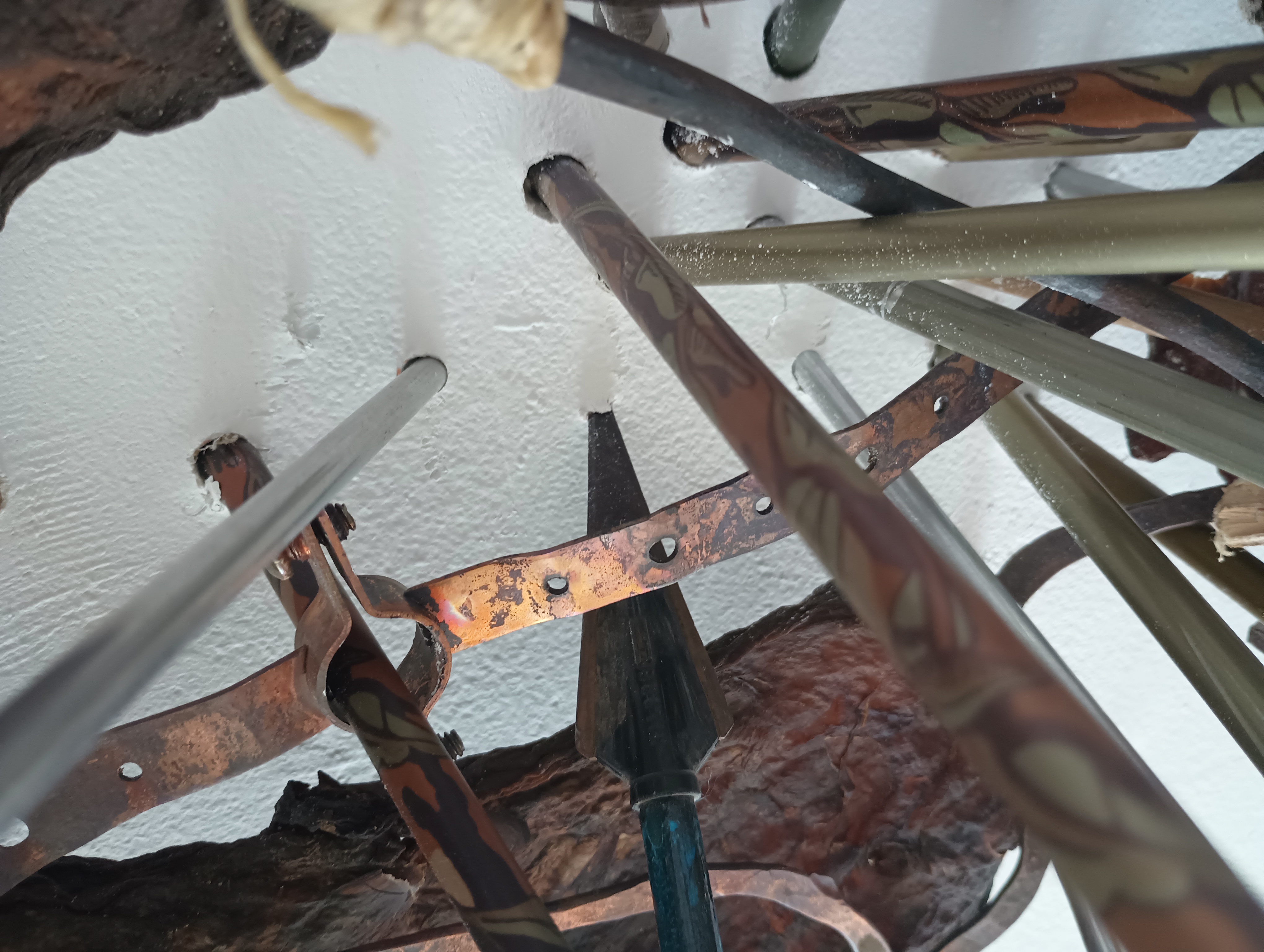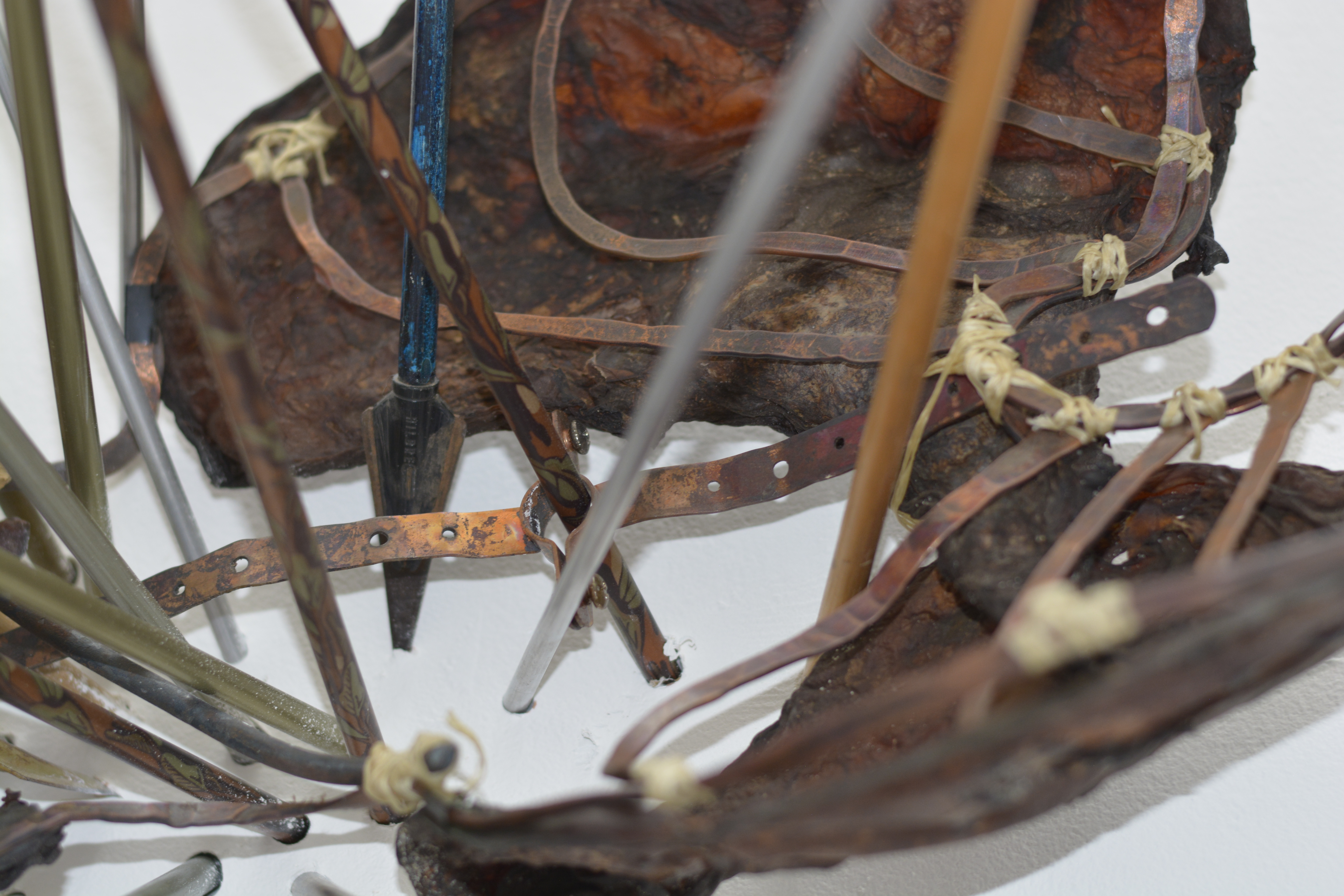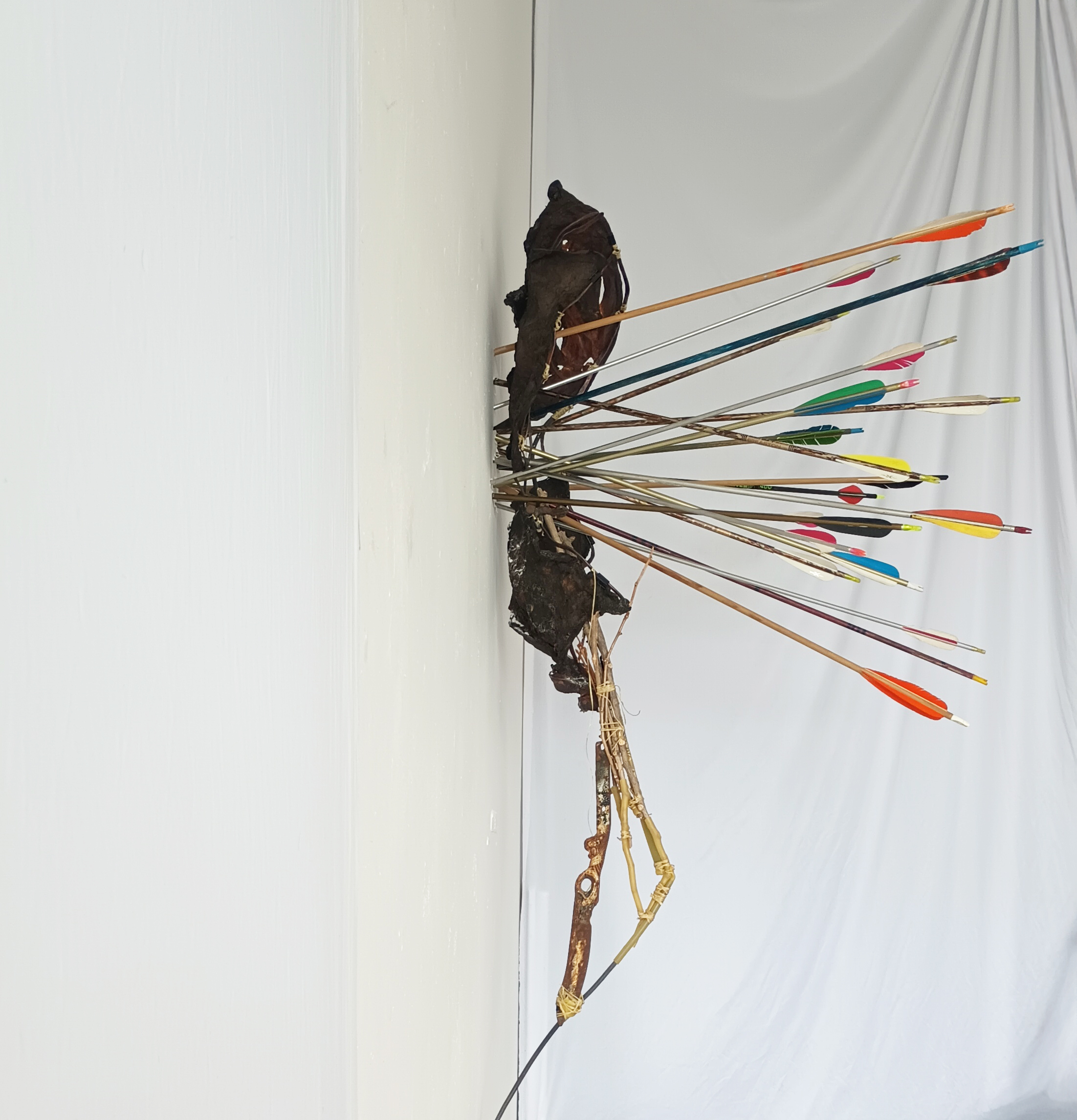 Bacterial cellulose, hammered copper, artificial sinew, rubber, assorted vintage arrows, drywall, found metal and wood. One of the Saint Sebastian series of works. 2025.
