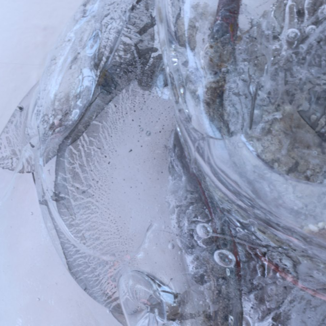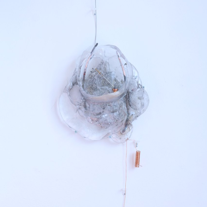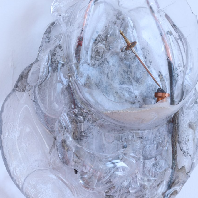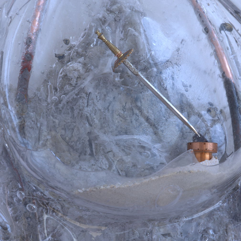 Radio receiver made of hot casted glass, copper, silver antennae, galena lead crystal, sand, concrete, and one of my grandfather's cocktail swords.